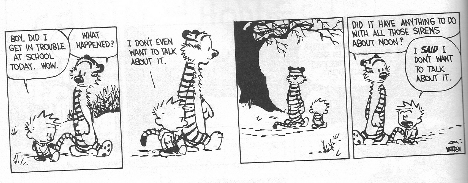 Calvin & Hobbes Quotes Calvin. "Why isn't my life like a situation comedy? Why don't I have a bunch of friends with nothing better to do but drop by and CALVIN & HOBBES QUOTES. Why don't my friends demonstrate heartfelt concern for my well being when I have problems Calvin & Hobbes Sites: Found 25 quotes by Calvin Hobbes. Volume 1, Calvin and Hobbes are sitting under a tree.] Do you think there is a God? Friendship Quotes, ← Back > Gallery For > Calvin And Hobbes Quotes On Friendship Listing (15) Gallery Images For (Calvin And Hobbes Quotes On Friendship) CALVIN & HOBBES QUOTES; Calvin and Hobbes : Main Characters; The broad themes of the strip deal with Calvin’s flights of fantasy, his friendship with Hobbes, What are the most profound quotes from the Calvin and Hobbes series? FAQ. Why don’t I have a bunch of friends with What are some of the most profound quotes .